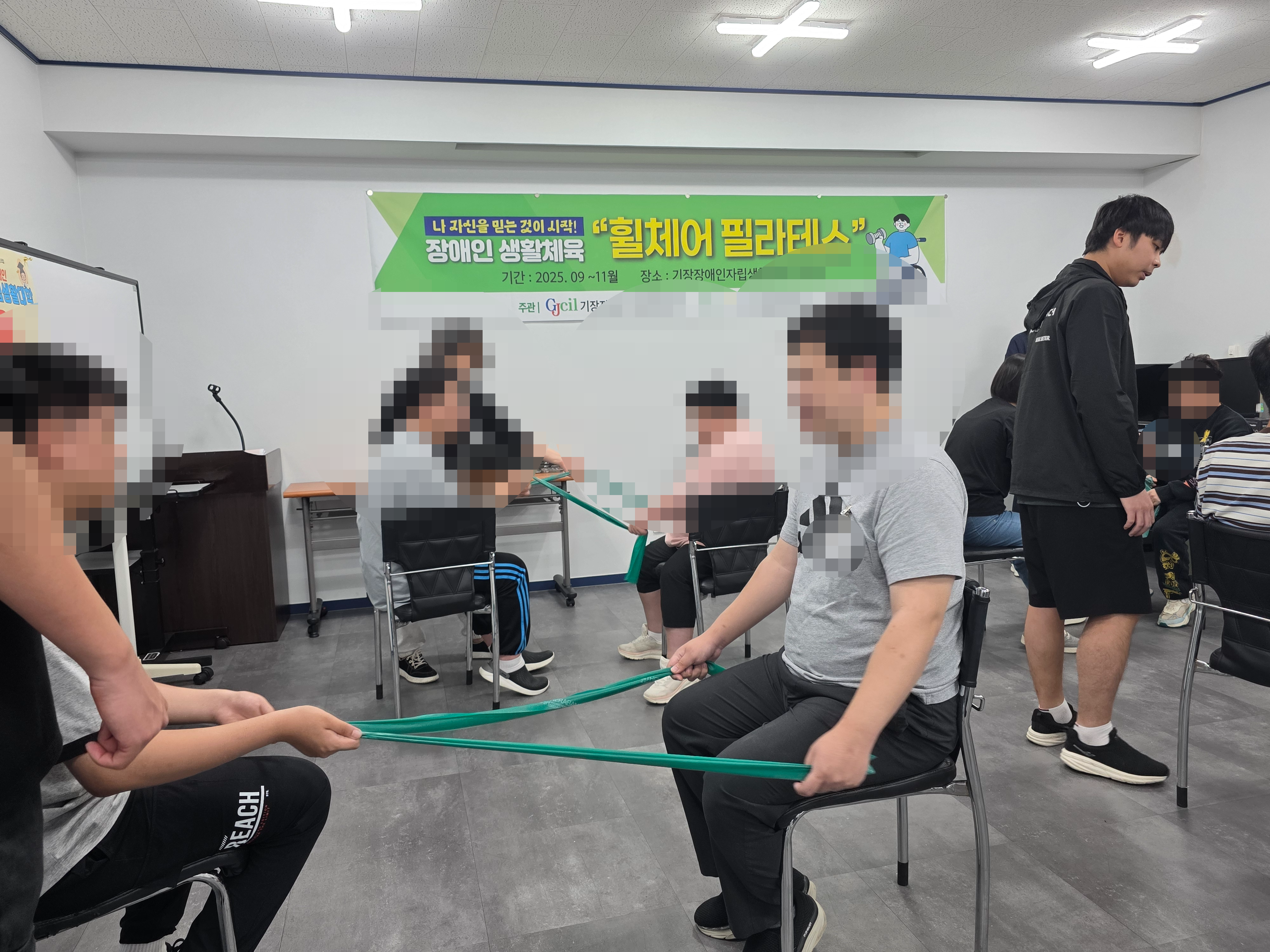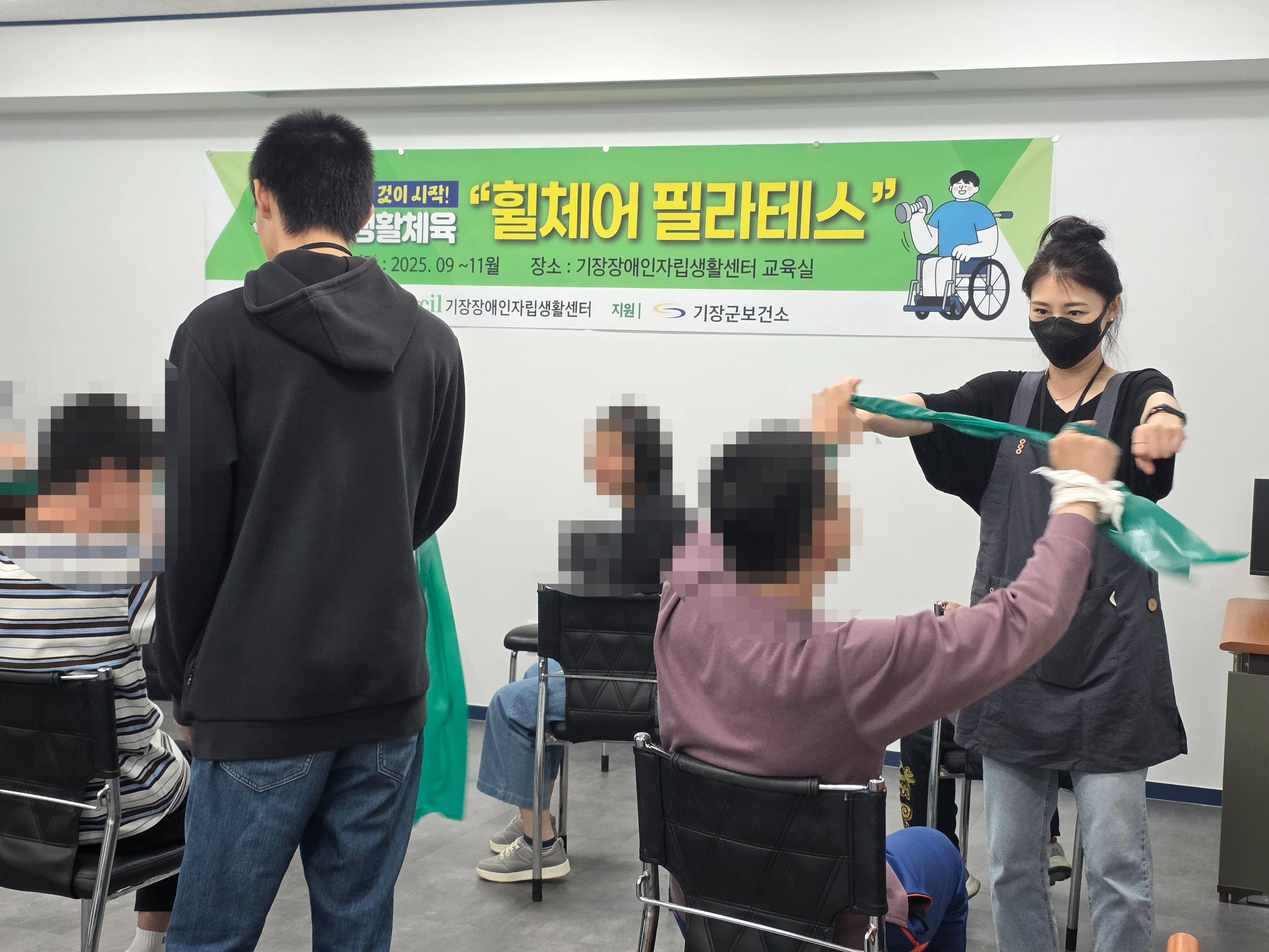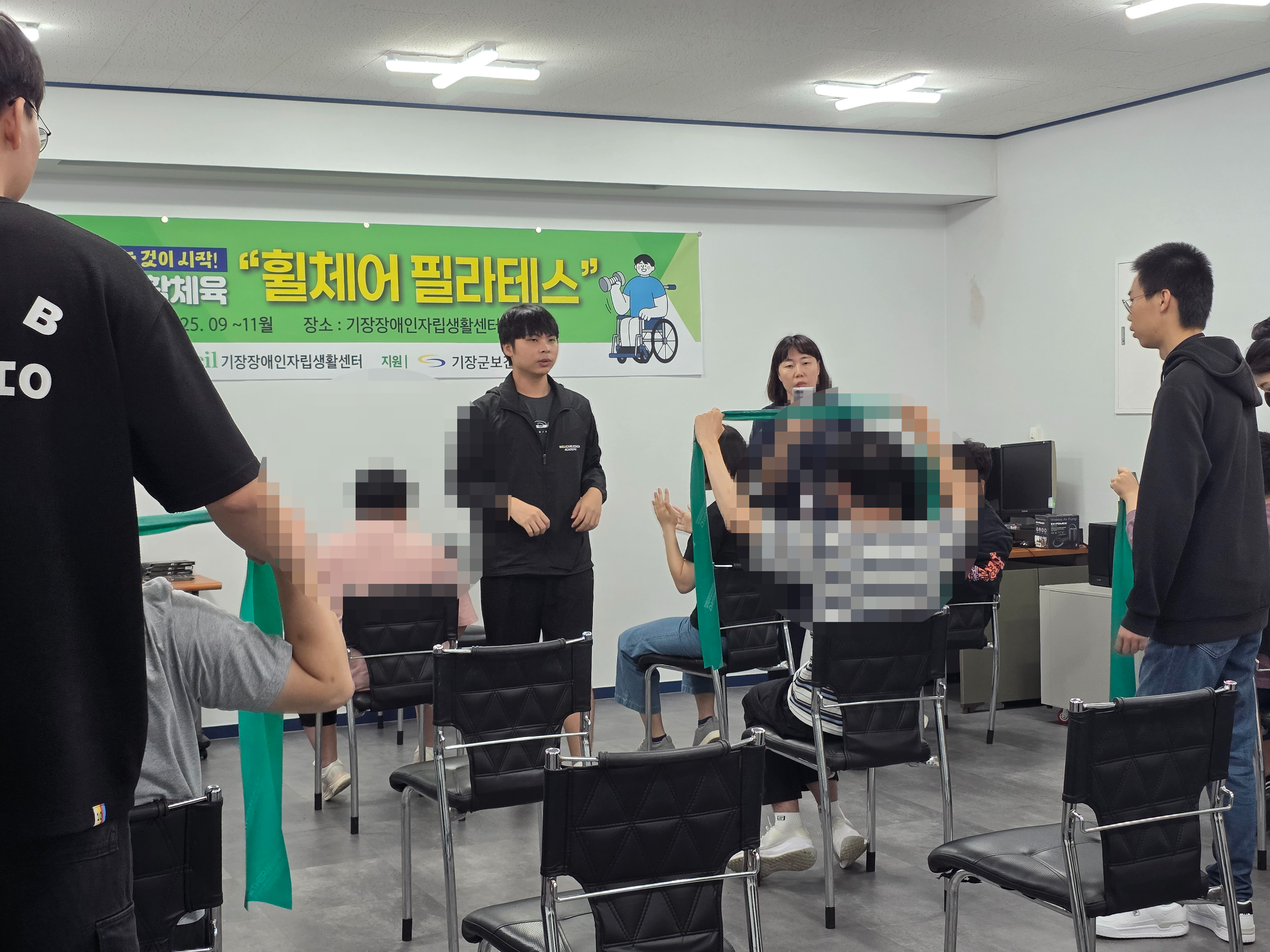 2025년 장애인 생활체육 '휠체어 필라테스' Part 3. ○ 일 시 : 2025.10.16.(목), 13:00 ~14:00 ○ 장 소 : 기장장애인자립생활센터 교육실 ○ 참여인원 : 기장군 거주 발달장애인 및 휠체어 장애인 11명 ○ 내 용 : 장애인 생활체육 '휠체어 필라테스' 강좌 ○ 강 사 : 조성익( 필라테스 강사) ○ 주 관 : 기장장애인자립생활센터 ○ 지 원 : 기장군 보건소