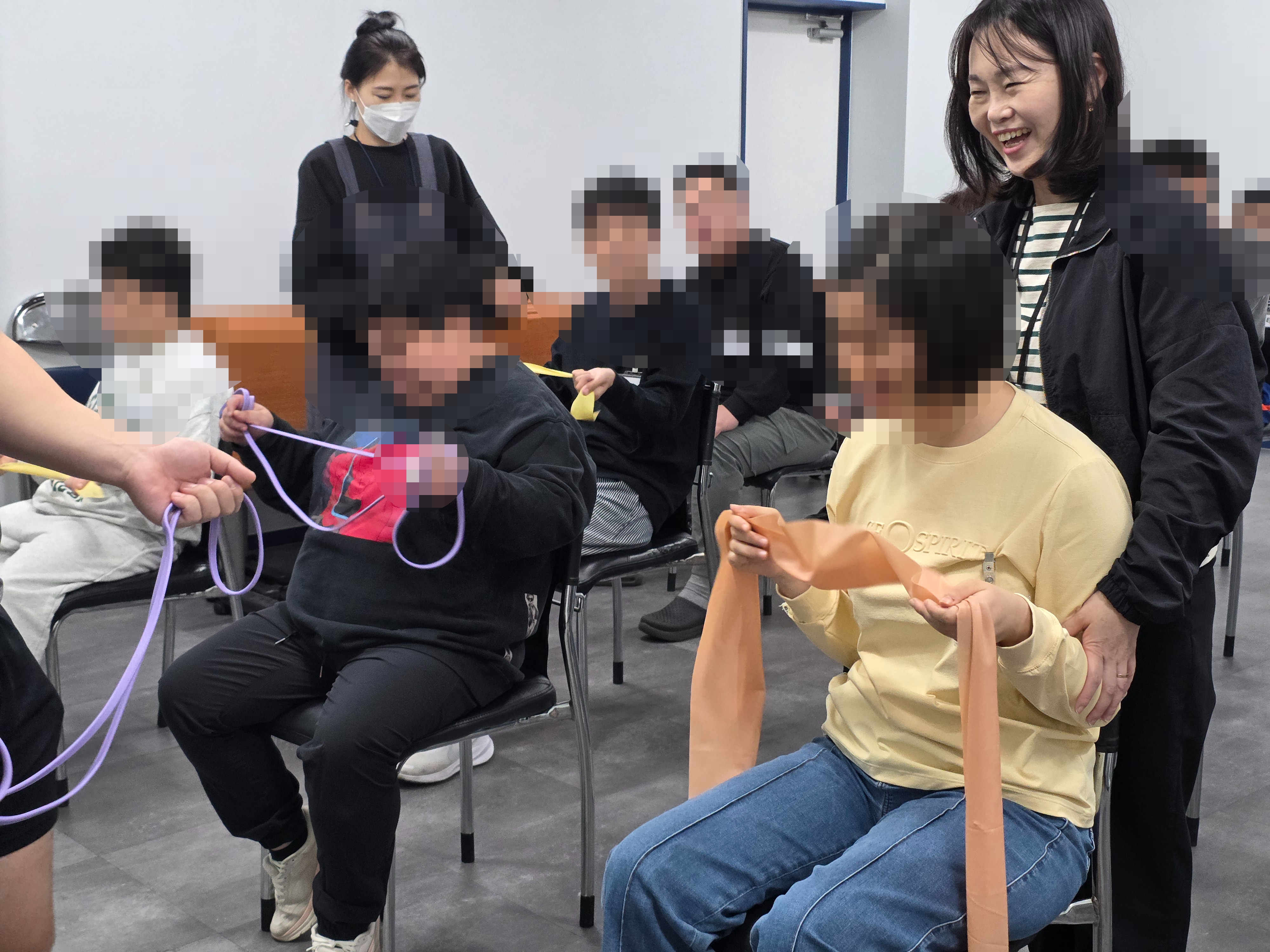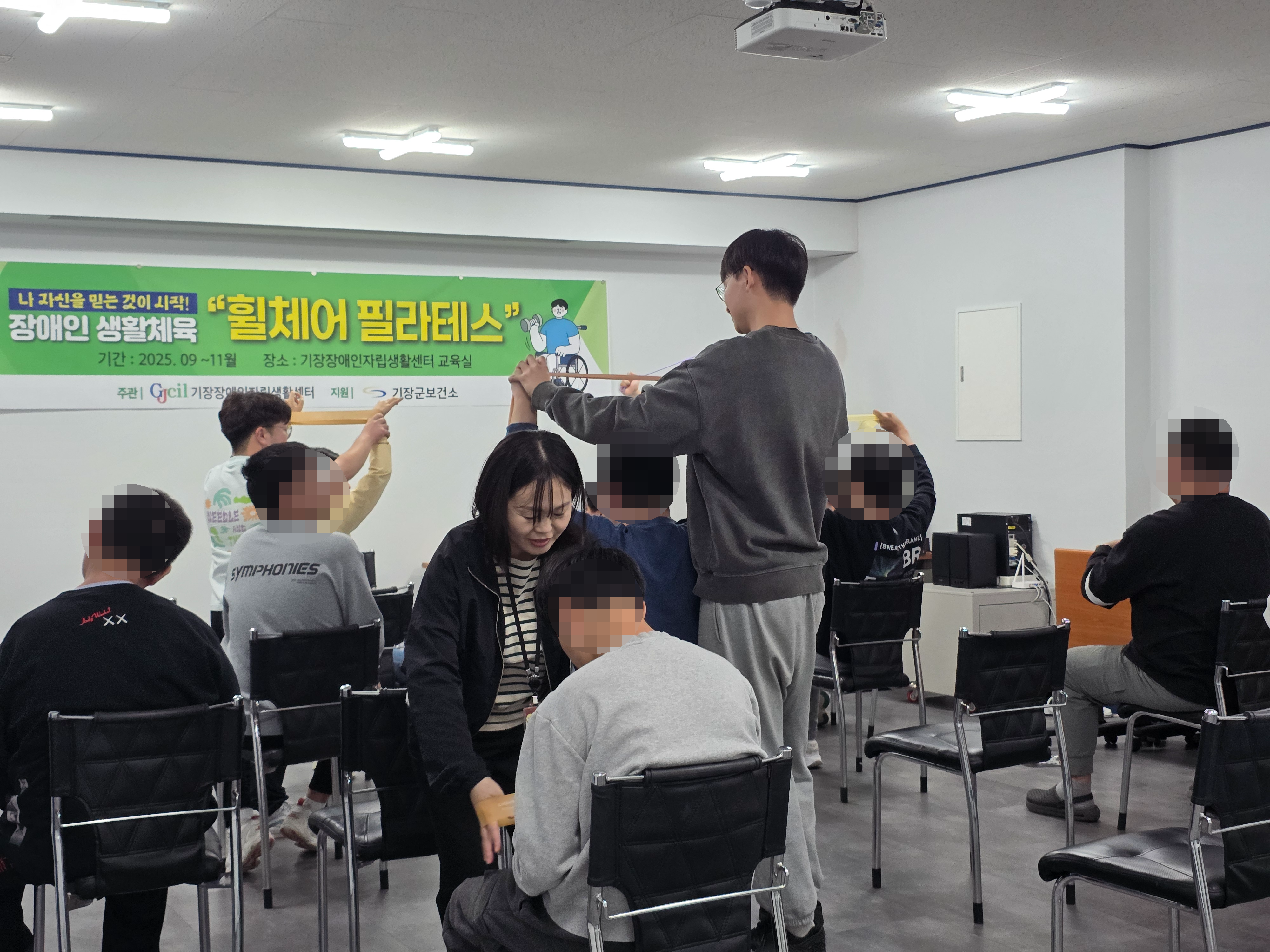 2025년 장애인 생활체육 '휠체어 필라테스' Part 4. ○ 일 시 : 2025.10.23.(목), 13:00 ~14:00 ○ 장 소 : 기장장애인자립생활센터 교육실 ○ 참여인원 : 기장군 거주 발달장애인 및 휠체어 장애인 10명 ○ 내 용 : 장애인 생활체육 '휠체어 필라테스' 강좌 ○ 강 사 : 조성익 (필라테스 강사) ○ 주 관 : 기장장애인자립생활센터 ○ 지 원 : 기장군 보건소