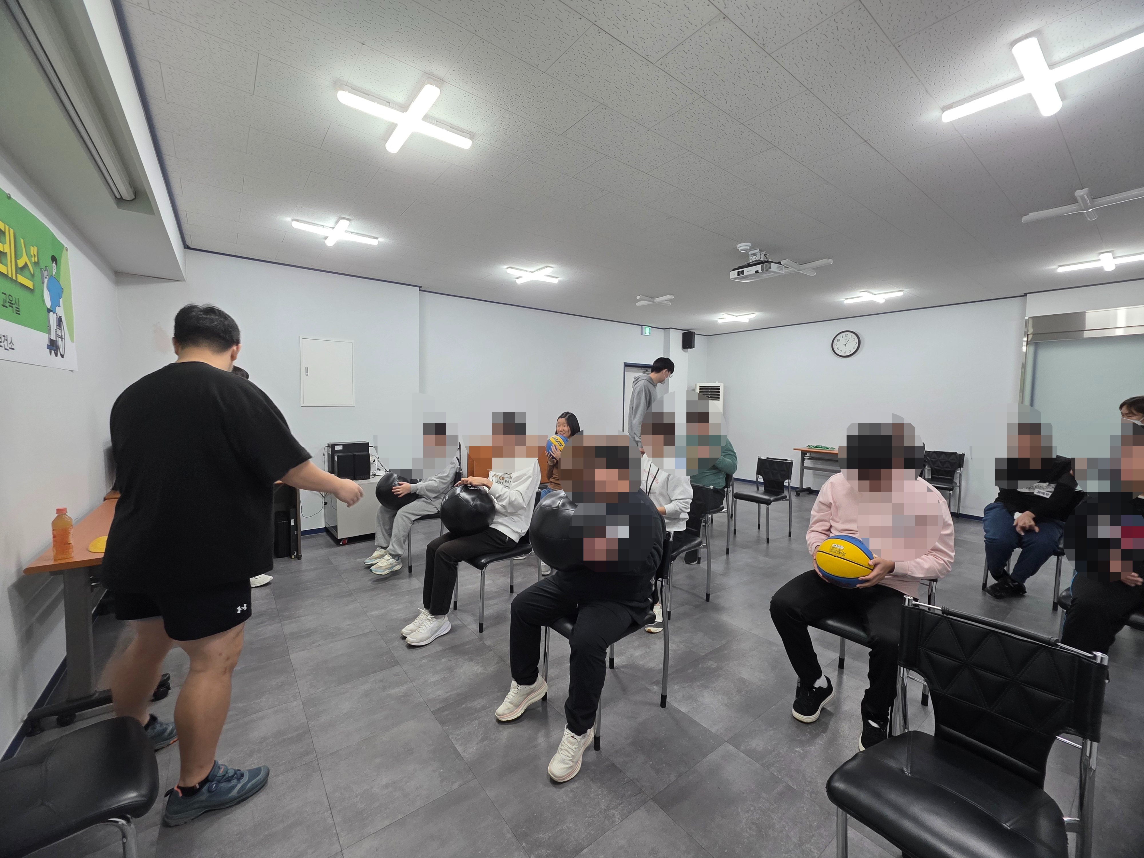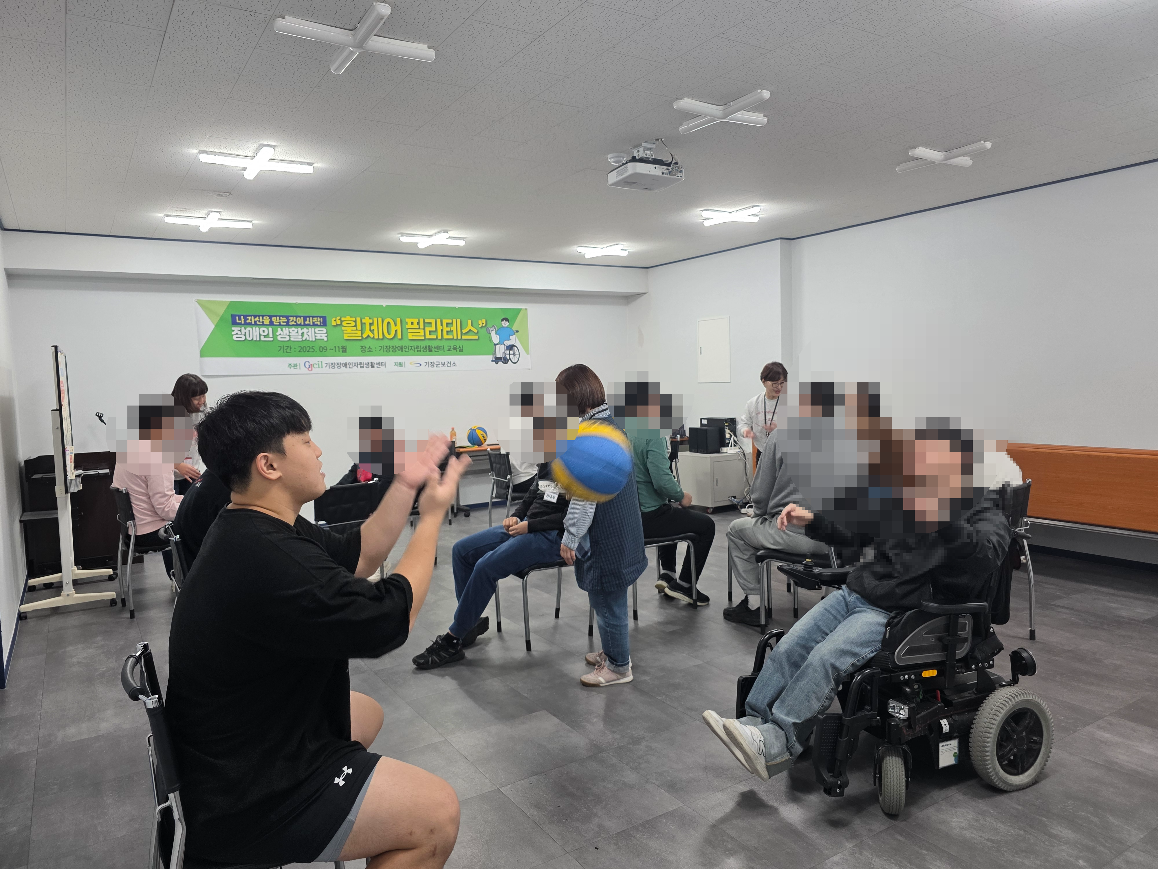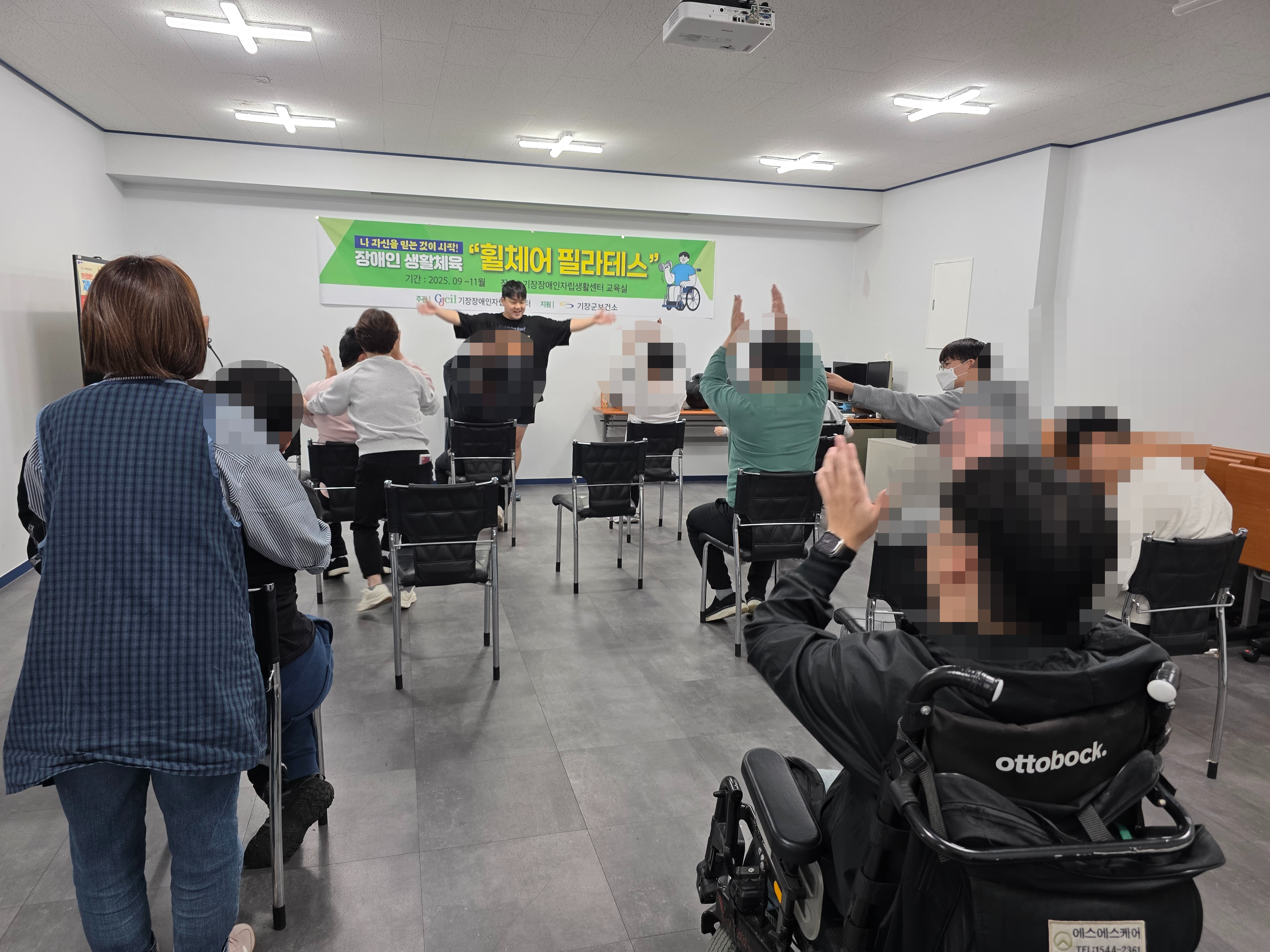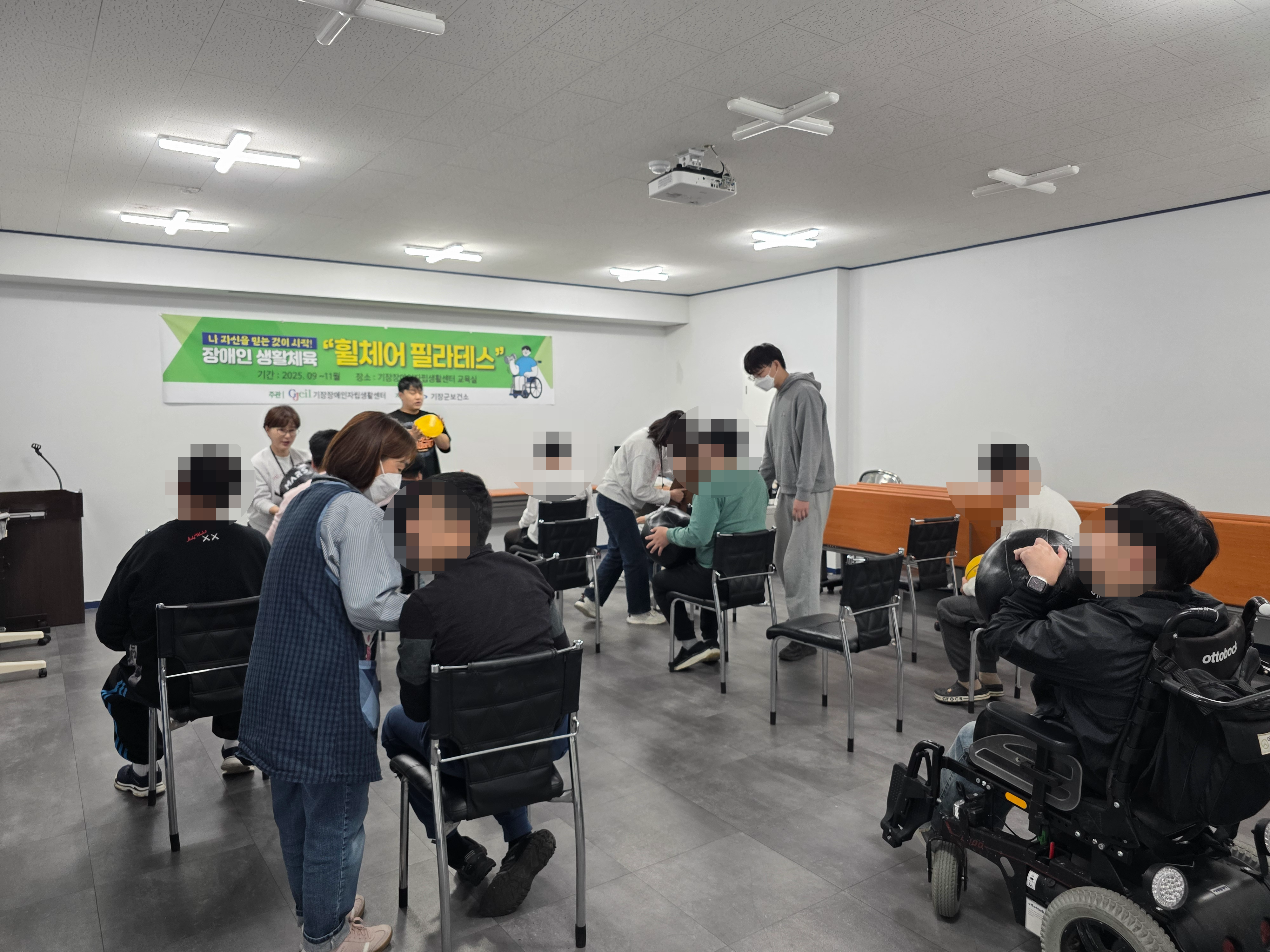 2025년 장애인 생활체육 '휠체어 필라테스' Part 5. ○ 일 시 : 2025.10.30.(목), 13:00 ~14:00 ○ 장 소 : 기장장애인자립생활센터 교육실 ○ 참여인원 : 기장군 거주 발달장애인 및 휠체어 장애인 11명 ○ 내 용 : 장애인 생활체육 '휠체어 필라테스' 강좌 ○ 강 사 : 조성익(필라테스 강사) ○ 주 관 : 기장장애인자립생활센터 ○ 지 원 : 기장군 보건소