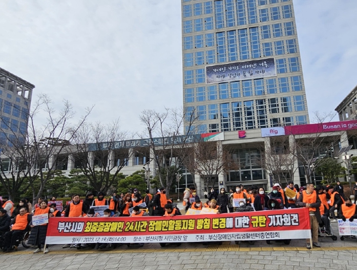 부산지역 최중증장애인 24시간 활동지원보장 촉구 기자회견 ❍ 일 시 : 2023. 12. 19.(화), 14:00 ❍ 장 소 : 부산광역시청 앞 시민광장 ❍ 참석인원 : 김성대 센터장 외 6명 ❍ 내 ..