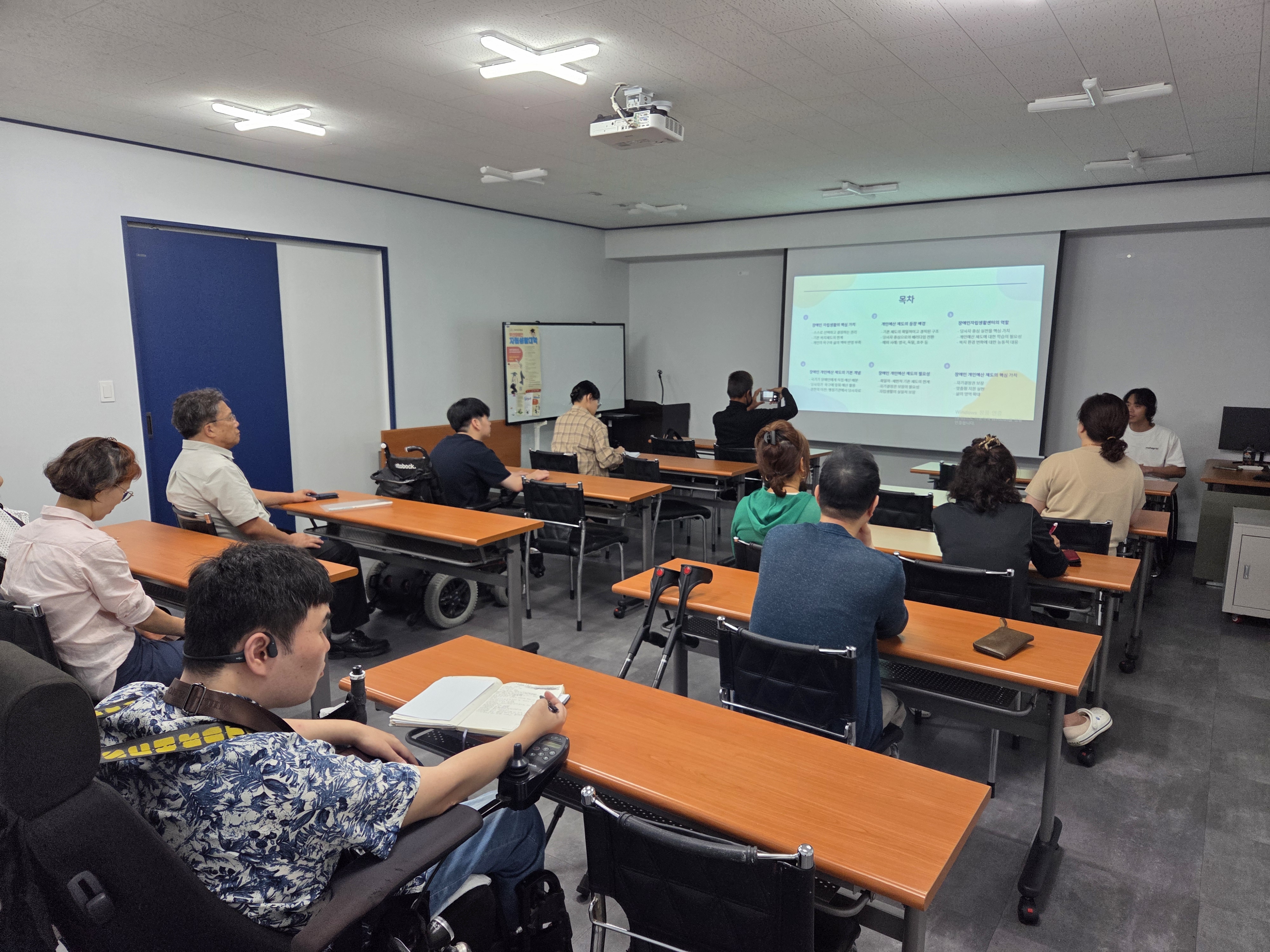 2025년 자립생활 이념교육 1강 ○ 일 시 : 2025.09.25(목), 14:00~16:00 ○ 장 소 : 기장장애인자립생활센터 교육실 ○ 대 상 : 장애인 및 비장애인 19명 ..