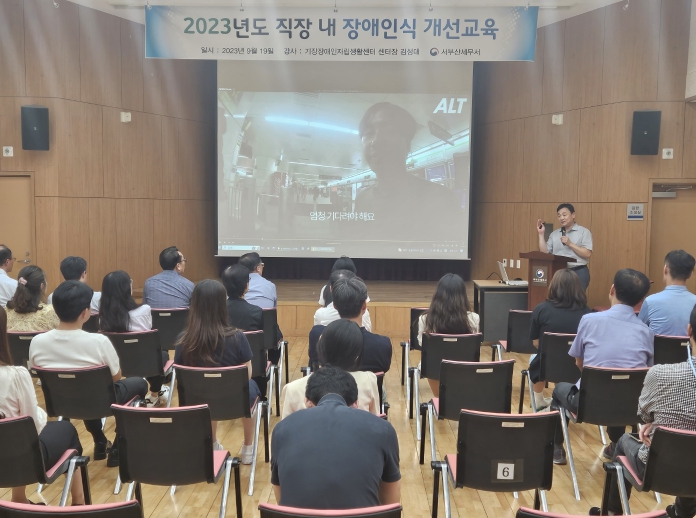 2023년도 직장 내 장애인 인식개선교육 ○ 수행기관명 : 기장장애인자립생활센터 ○ 교육대상 사업장명 : 서부산세무서(부산 사상구 서대신동 소재) ○ 교육일시 : 2023. 9. 19.(화), 13:30~14:30 ( 1시간) ○ 교육장소 : ..