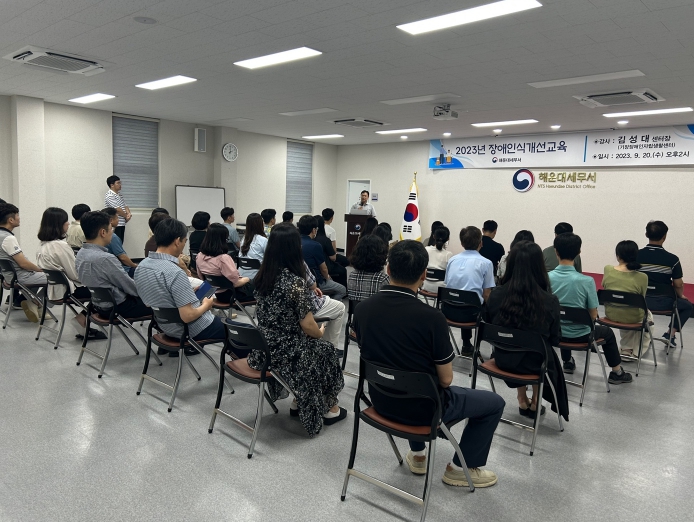 2023년도 직장 내 장애인 인식개선교육 ○ 수행기관명 : 기장장애인자립생활센터 ○ 교육대상 사업장명 : 해운대세무서(부산 해운대구 좌동 소재) ○ 교육일시 : 2023. 9. 20.(수), 14:00~15:00 ( 1시간) ○ 교육장소 : 해..