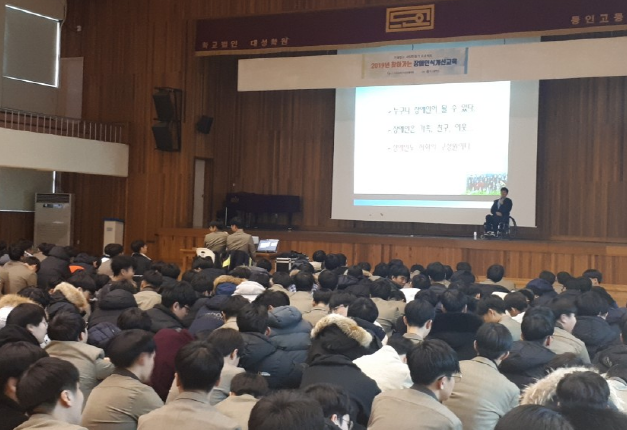 2019년도 장애인식개선교육○ 일 시 : 2019.11.27(수), 15:20~16:10○ 장 소 : 동인고등학교 강당○ 대 상 : 동인고등학교 1, 2학년 전교생 503명, 지도교사 1명○..