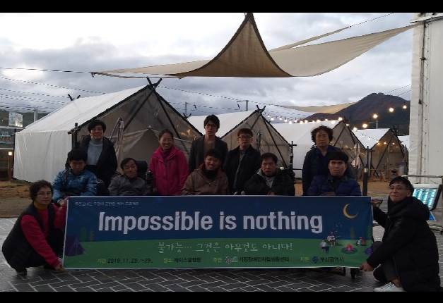 2019년 중증장애인 글램핑체험○ 기 간 : 2019.11.28(목) ~ 11.29(금)○ 장 소 : 제이스 펜션&글램핑 (부산 기장군 일광면 소재) ○ 참 여 : 중증장애인 이용자, 활..