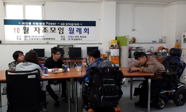 2018년 10월 자조모임 월례회 개최○ 일 시 : 2018.10.10.(수), 11:00○ 장 소 : 기장IL센터 회의실○ 대 상 : 기장IL센터 자조모임 회원 7명○ 내 용 - 2018 동..