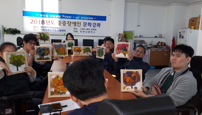 2018 중증장애인 문화강좌○ 일 시 : 2018.11.14(수), 14:00~16:00○ 장 소 : 기장장애인자립생활센터 교육실○ 참 여 : 중증장애인 이용자, 활동보조인 등 12명○ 내 ..