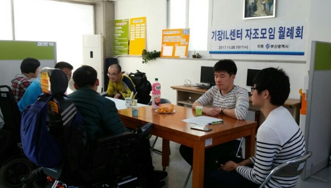 11월 기장장애인자립생활센터 자조모임 월례회○ 일 시 : 2017.11.08(수), 11:00○ 장 소 : 기장장애인자립생활센터 회의실○ 참 석 : 자조모임 단원 6명○ 내 용..