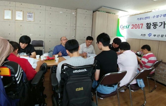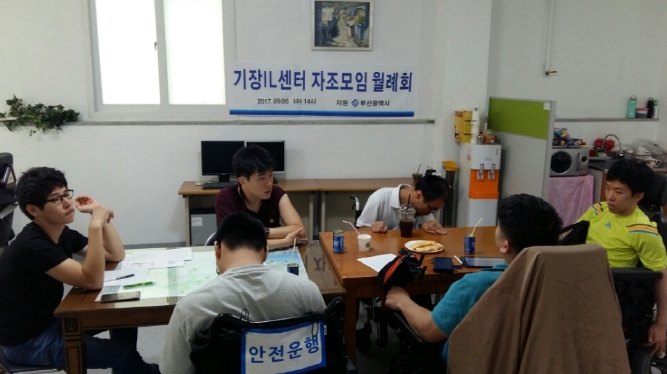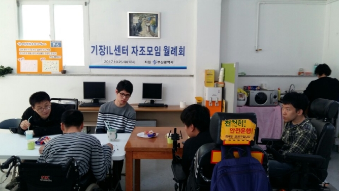 10월 기장장애인자립생활센터 자조모임 월례회○ 일 시 : 2017.10.25(수), 12:00○ 장 소 : 기장장애인자립생활센터 회의실○ 참 석 : 자조모임 단원 5명 (※단원 2명은 군청 직무교육 참석..