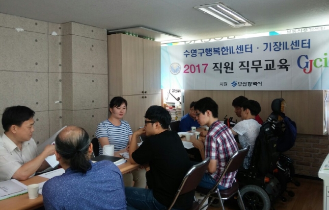 2017년도 하반기 직원 직무교육○ 일 시 : 2017.08.23(수), 11:00○ 장 소 : 수영구행복한장애인자립생활센터 교육실○ 참 석 : 기장IL센터 및 수영구행복한IL센터 직원 등 9명○ 강 사 - 기장장애인자립생활센..