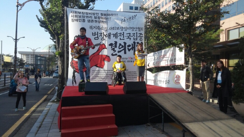 1.활 동 명 : 복지축소 및 사회보장 정비방안 철회 범장애계 전국 집중 결의대회 2 일 정 : 2015.10.27(화), 14:00~17:00 3. 장 소 : 이룸센터 맞은편 국민은행 앞 4...