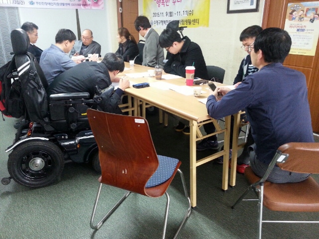 1.활 동 명 : 동료상담정기(양성)과정 2 일 정 : 2015.11.09(월) ~ 11(수) 3. 장 소 : 부산진장애인자립생활센터(부산진구 부전동 소재) 4. 활동사진