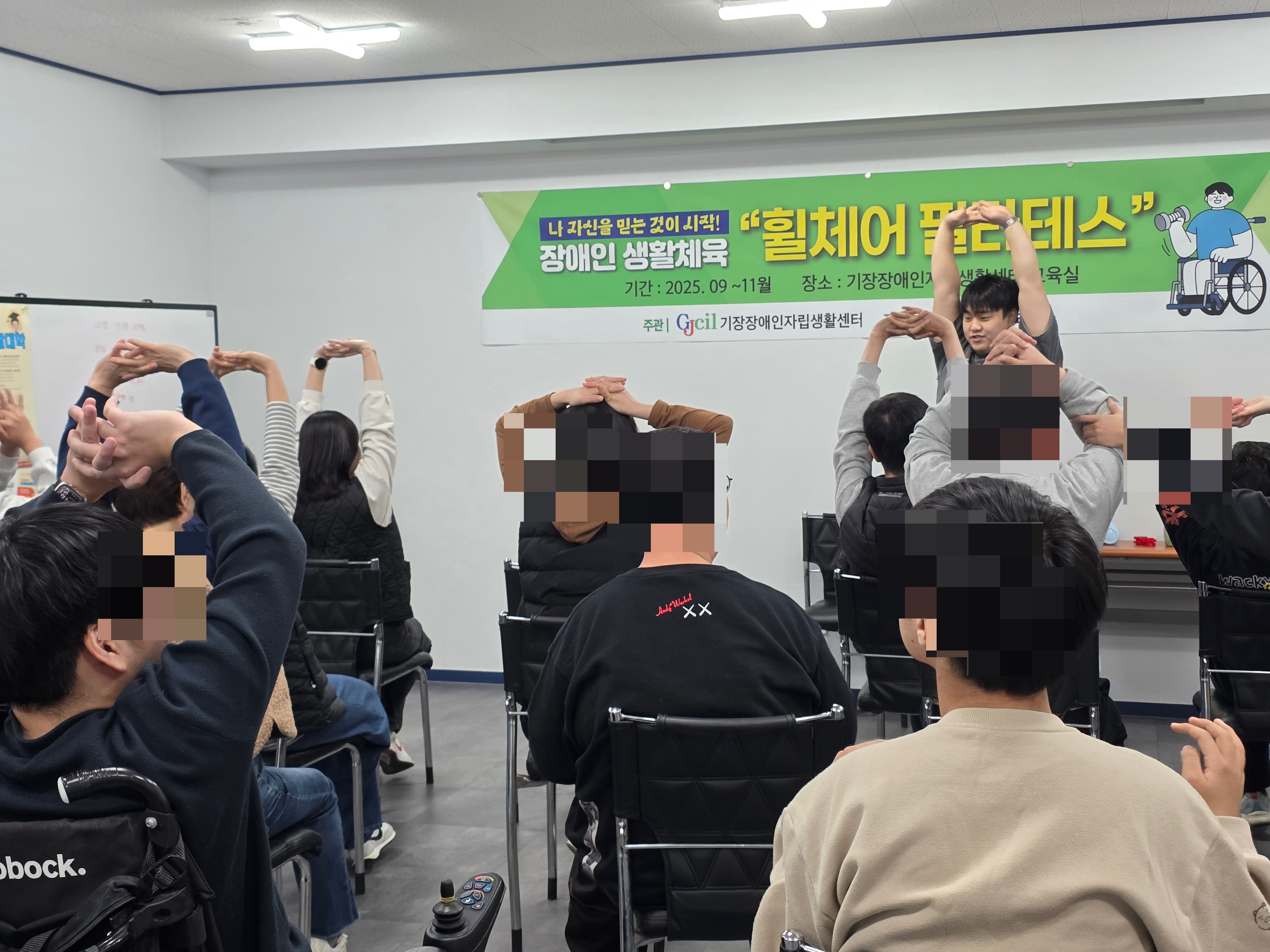 2025년 장애인 생활체육 '휠체어 필라테스' Part 6. ○ 일 시 : 2025.11.06.(목), 13:00 ~14:00 ○ 장 소 : 기장장애인자립생활센터 교육실 ○ 참여인원 : 기장군 거주 발달장애인 및 휠체어 장애인 10명 ○ 내 용 : 장애인 생활체육 '휠체어 필라테스' 강좌 ○ ..