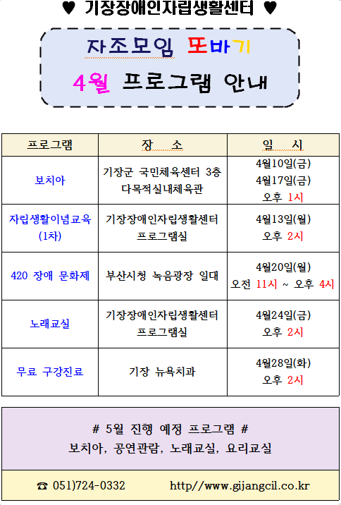 2026년 문화 및 여가활동 - 노래교실 ○ 일 시 : 2026.03.27(금), 14:00 ○ 장 소 : 기장장애인자립생활센터 회의실 ○ 대 상 : 센터 이..